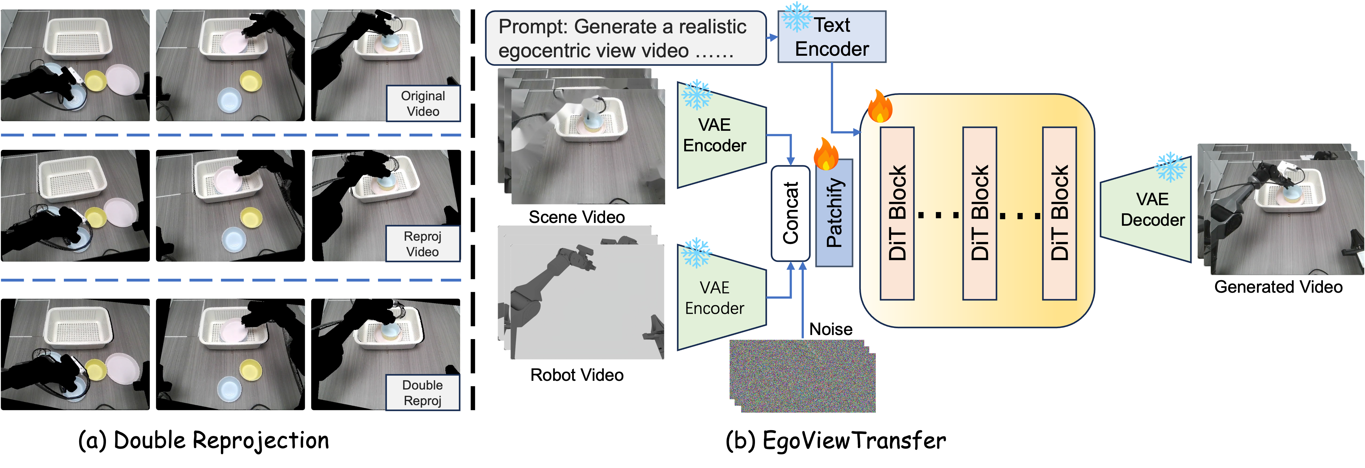 EgoViewTransfer. (a) Double reprojection. It simulates artifacts and occlusions caused by viewpoint change. The double reprojected video are aligned with the original video to form input/label pairs for training. (b) Architecture of EgoViewTransfer. The model takes a degraded scene video and a robot video as conditions and generates egocentric observation videos consistent with dual inputs.