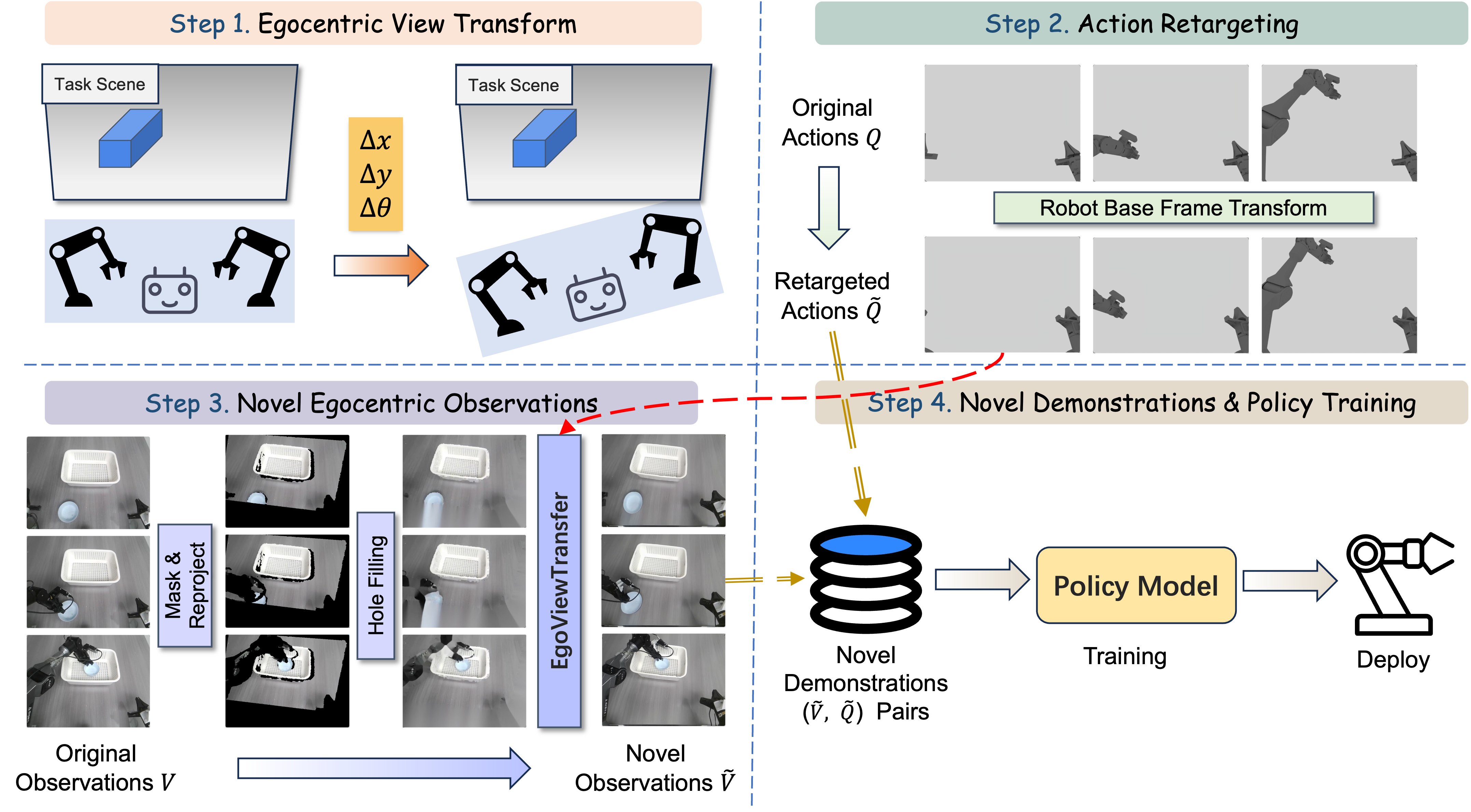 Overview of EgoDemoGen. (1) Egocentric View Transform: a Novel Egocentric View is specified by robot base motion \((\Delta x,\ \Delta y,\ \Delta \theta)\). (2) Action Retargeting: the original joint actions \(Q\) is retargeted into the novel robot base frame to yield a kinematically feasible joint actions \(\tilde{Q}\). (3) Novel Egocentric Observations: starting from the original observation video \(V\), we mask the robot, reproject the scene to the novel viewpoint, perform hole filling, and apply EgoViewTransfer to synthesize the coherent observations \(\tilde{V}\). (4) Novel Demonstrations & Policy Training: we obtain aligned pairs \((\tilde{V},\ \tilde{Q})\) for training egocentric viewpoint-robust policies.