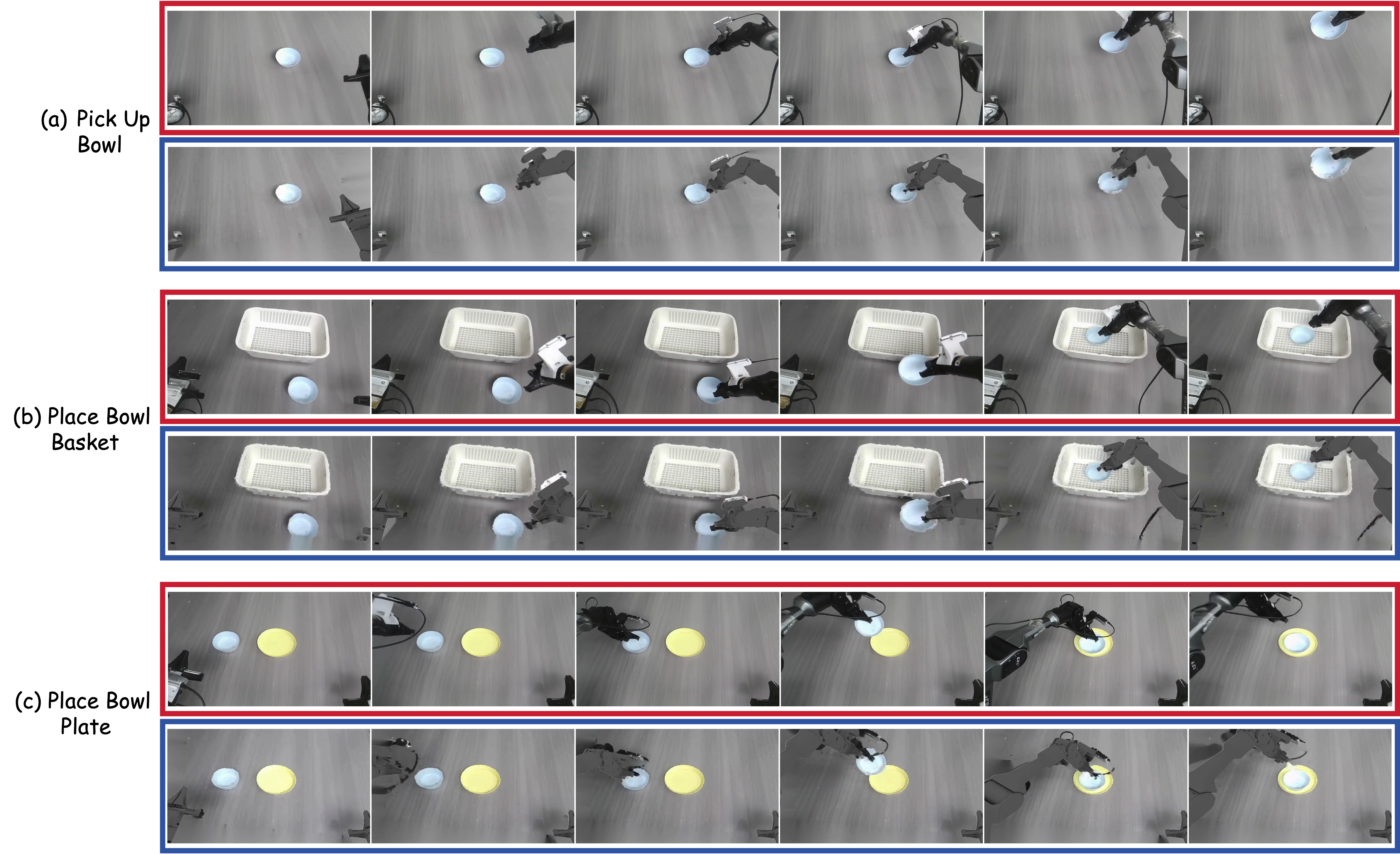 Visualization of EgoViewTransfer in Real World. The red boxes denote the Video w/ EgoViewTransfer, the blue boxes denote the Video w/o EgoViewTransfer (Naive Composition).