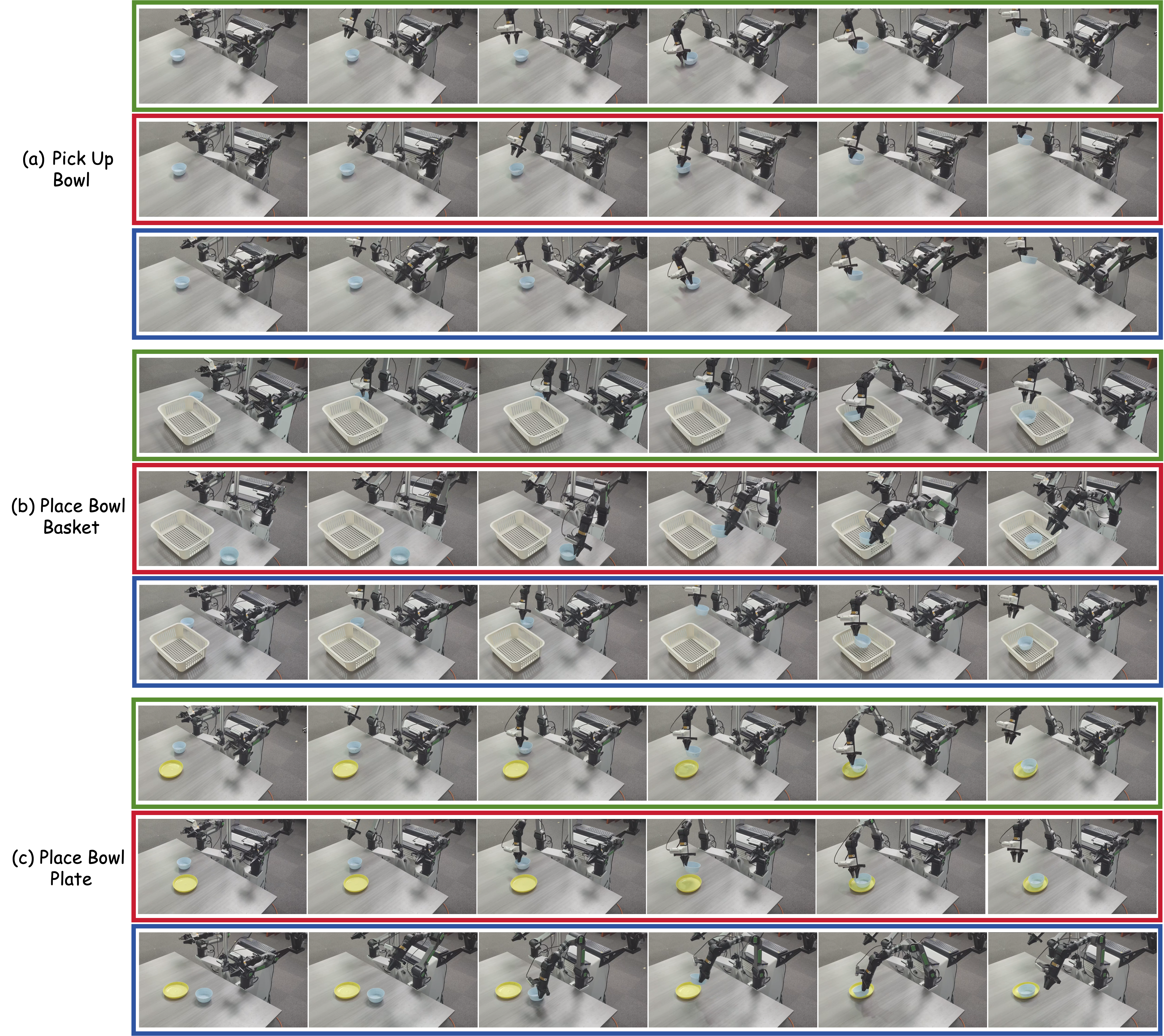 Visualization of policy execution in the Real World. The green boxes denote the standard egocentric view, the red boxes denote the counterclockwise egocentric view, and the blue boxes denote the clockwise egocentric view.