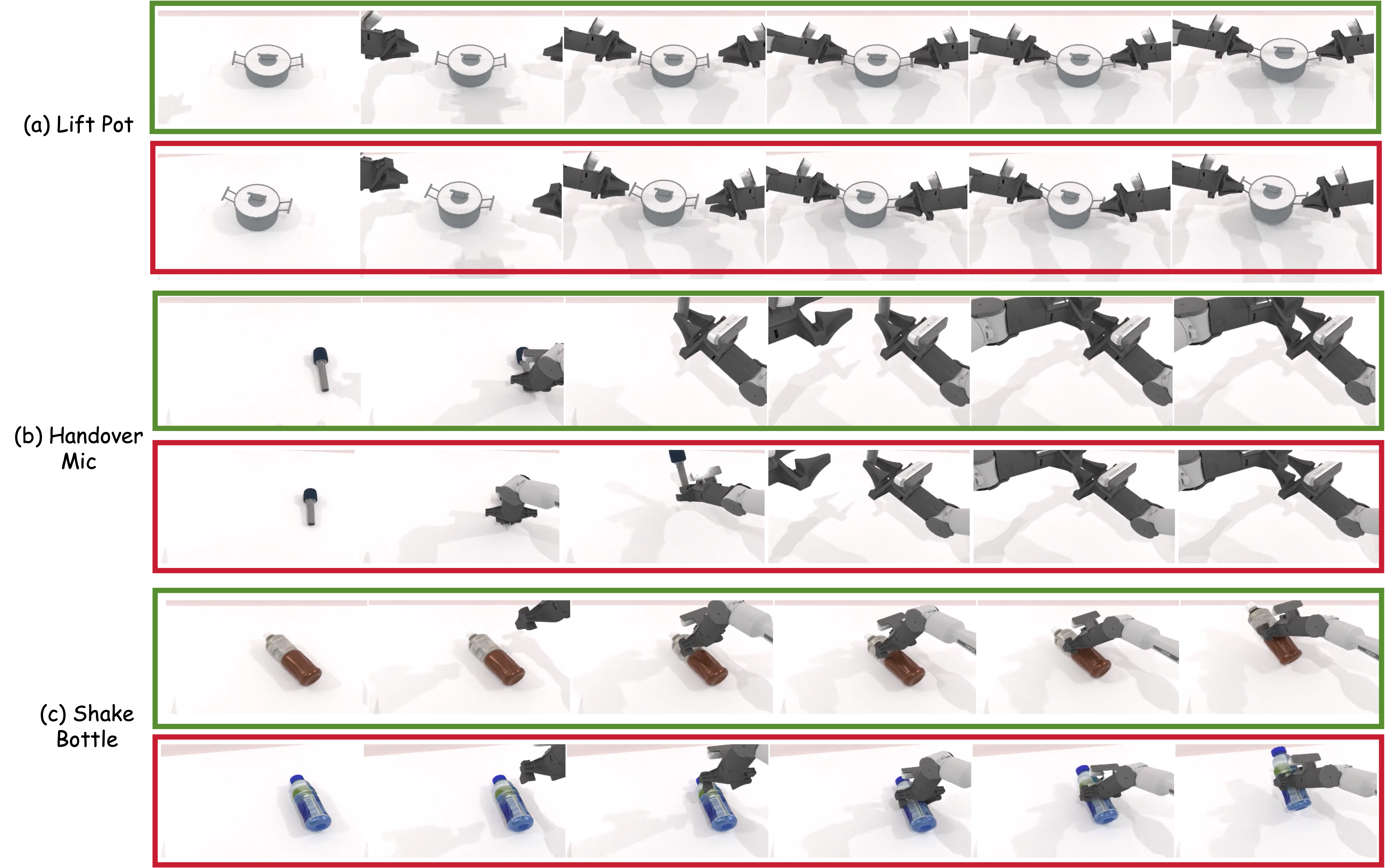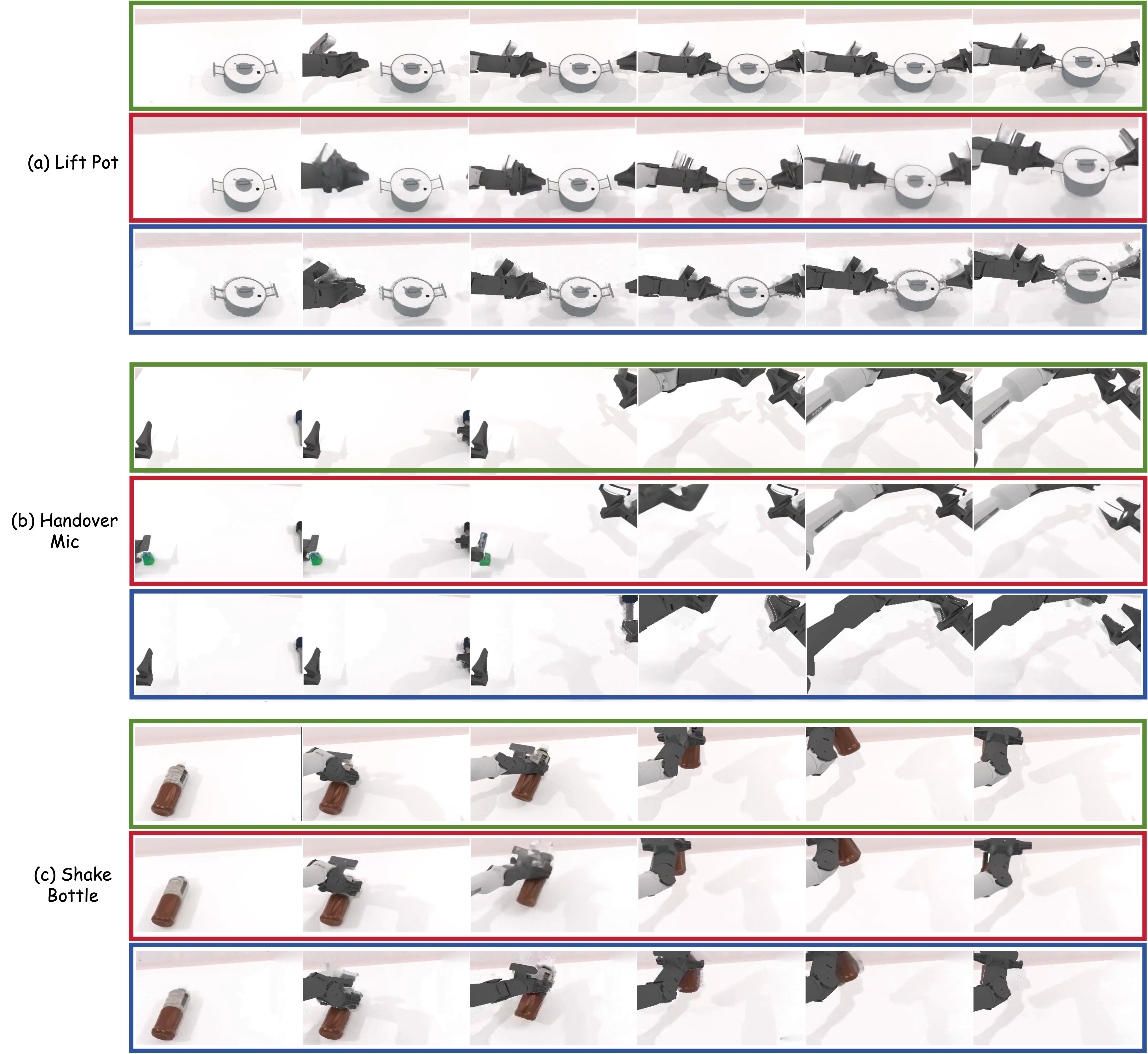 Visualization of EgoViewTransfer in Simulation. The green boxes denote the GT video, the red boxes denote the Video w/ EgoViewTransfer, and the blue boxes denote the Video w/o EgoViewTransfer (Naive Composition).